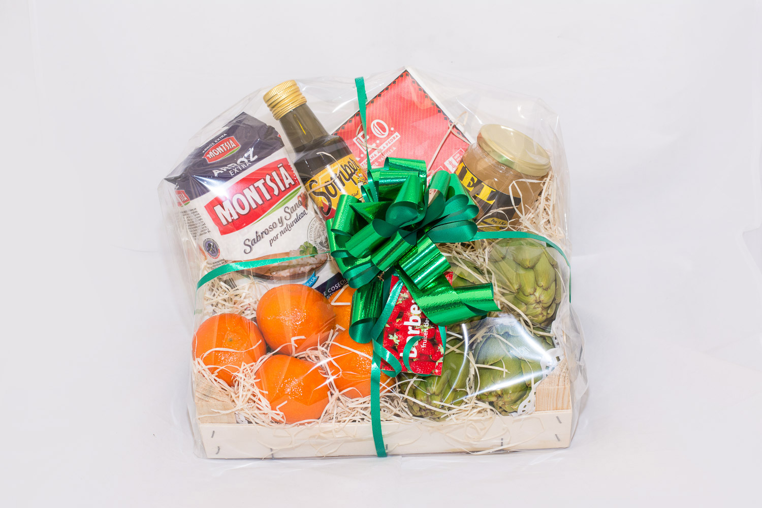 1 Btll. Vermouth “Rapitenc “ 1 Btll. Licor d´arrós “Segadors del Delta” 1 Btll. Vi Negre Almodi D.O. Terra Alta 1 Btll. Oli Extra Verge 0,500 “La Mundana” 1 Paq. Arrós Bomba 0,500 “Moli de Rafelet” 1 Pot Mel Taronger 250gr. “Rossend Margalef” 1 Pot Sals Sabors Variades “Salines de la Trinitat” 1 Pll. Torró Xocolate amb Ametlles 350gr. “Masdeu” 1 Pll. Torró Xixona 175gr. “Masdeu” 1 Caixa decorada