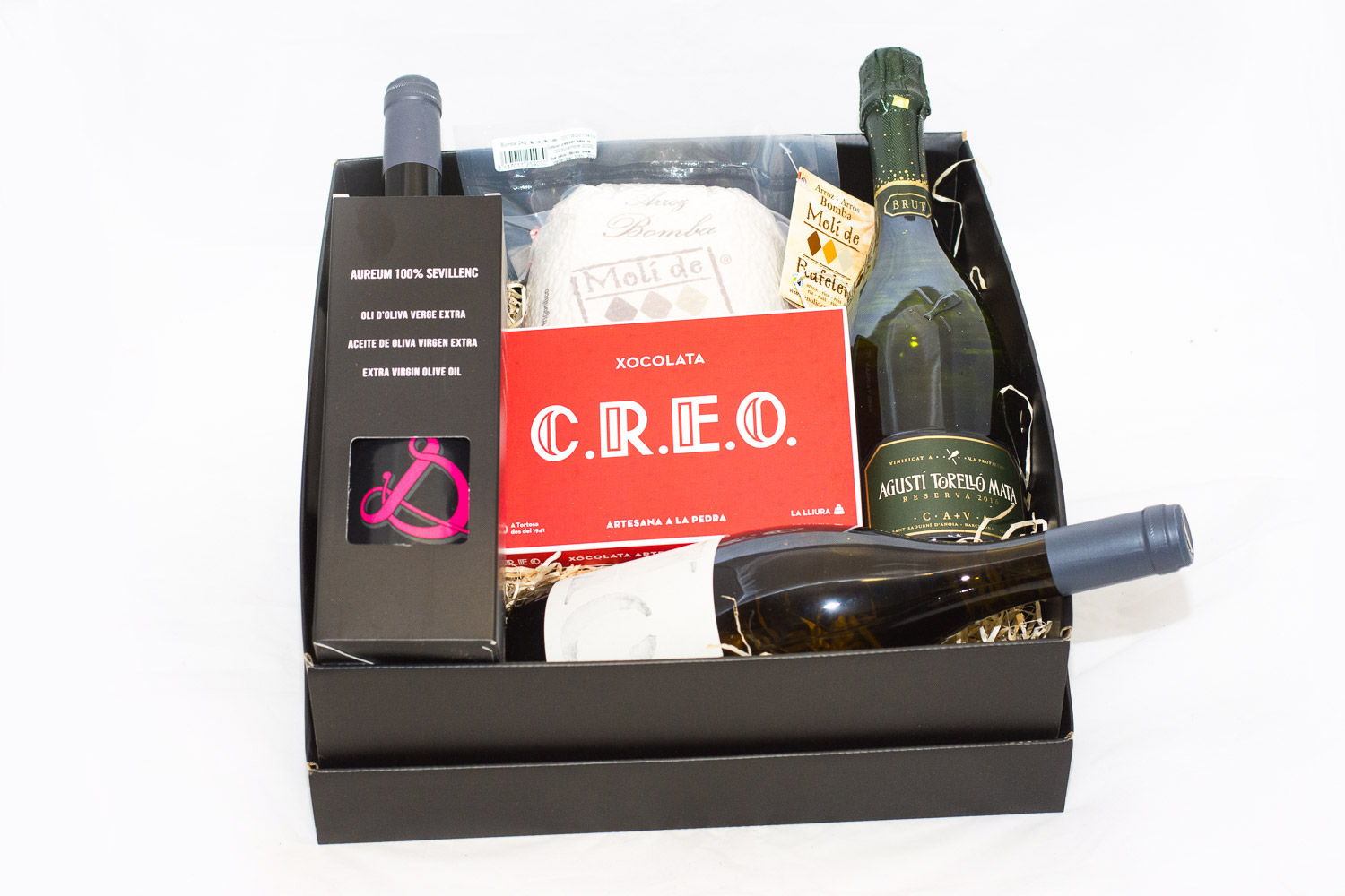 Caixa amb tapa Arròs Bomba Molí de Rafalet 2kg Oli V.E Sevillenc Cava Agustí Torrello Brut Xocolate Creo 400 grs. Vi Ilercavonia blanc Vi Domus pensi